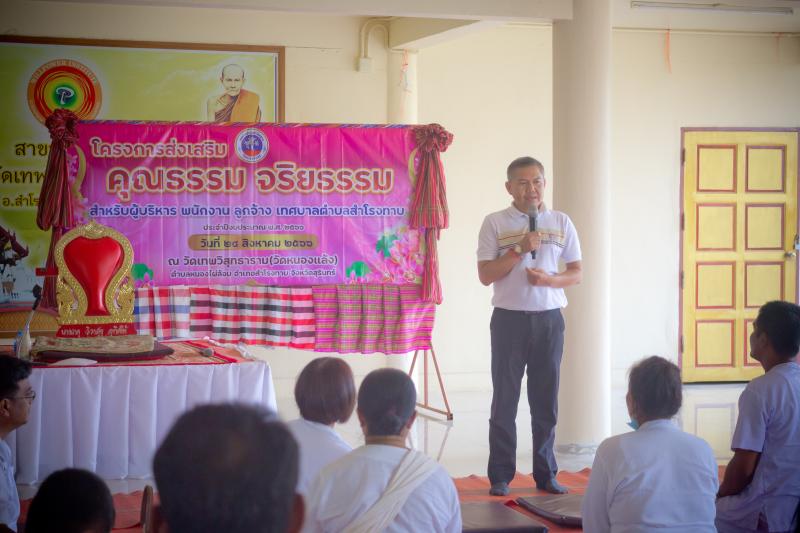 description วันที่ 24 สิงหาคม 2566 เทศบาลตำบลสำโรงทาบดำเนินโครงการส่งเสริมคุณธรรมจริยธรรมสำหรับผู้บริหาร พนักงาน ลูกจ้างเทศบาลตำบลสำโรงทาบ ประจำปีงบประมาณ พ.ศ. ๒๕๖๖ ณ วัดเทพวิสุทธาราม (วัดหนองแล้ง) ตำบลหนองไผ่ล้อม อำเภอสำโรงทาบ จังหวัดสุรินทร์ โดยนายสมบัติ วิวาสุข นายกเทศมนตรีตำบลสำโรงทาบ เป็นประธานในพิธีเปิดโครงการดังกล่าว เพื่อให้เจ้าหน้าที่ในหน่วยงานภายใต้สังกัดเทศบาลตำบลสำโรงทาบ มีคุณธรรมและจริยธรรม ซื่อสัตย์สุจริตมีจิตสำนึกที่ดีและรับผิดชอบต่อหน้าที่ รวมถึงคิดถึงประโยชน์ส่วนรวม มีจิตสาธารณะ person admin